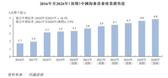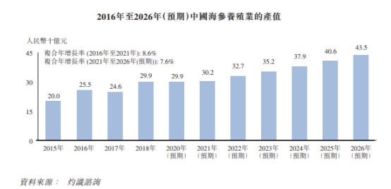 最近几年,随着海参养殖技术的进步和全国养殖规模的扩大,中国海参市场快速扩张。据灼识咨询数据显示,2021年中国海参养殖业的产值高达302亿元(人民币,下同),2016年至2021年的复合年增长率约为8.6%。预计在消费升级及标准化行业法规的推动下,中国海参养殖的产值将增至2026年的435亿元,复合年增长率约为7.6%。