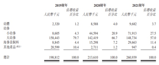 其中,幼参销售是的公司主要收入来源。报告期内,幼参销售收入维持稳定增长,分别为1.67亿元、1.87亿元及2.26亿元,占公司总收益的84.0%、87.6%及84.5%。