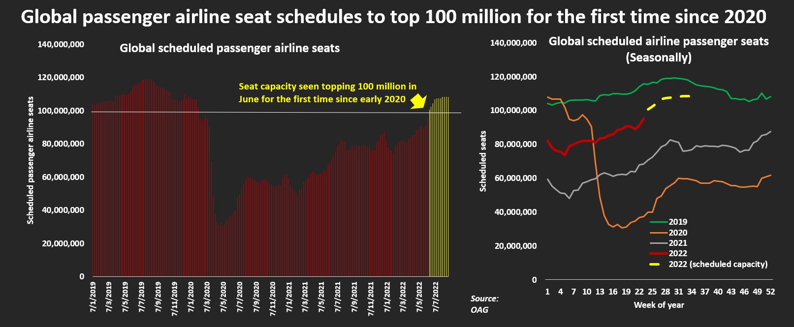 全球航空旅行数据机构OAG表示,尽管机票价格和燃油附加费不断上涨,但在过去三个月里,全球航空公司的运力依然稳步上升。OAG表示,全球航空公司运力本周增加了约1200万个座位数,至9520万个。该机构表示,全球航空公司运力将在下周达到1.006亿个座位数,这将是自2020年初以来首次突破1亿个座位数,且该指标将在8月中旬攀升至1.085亿个座位数。