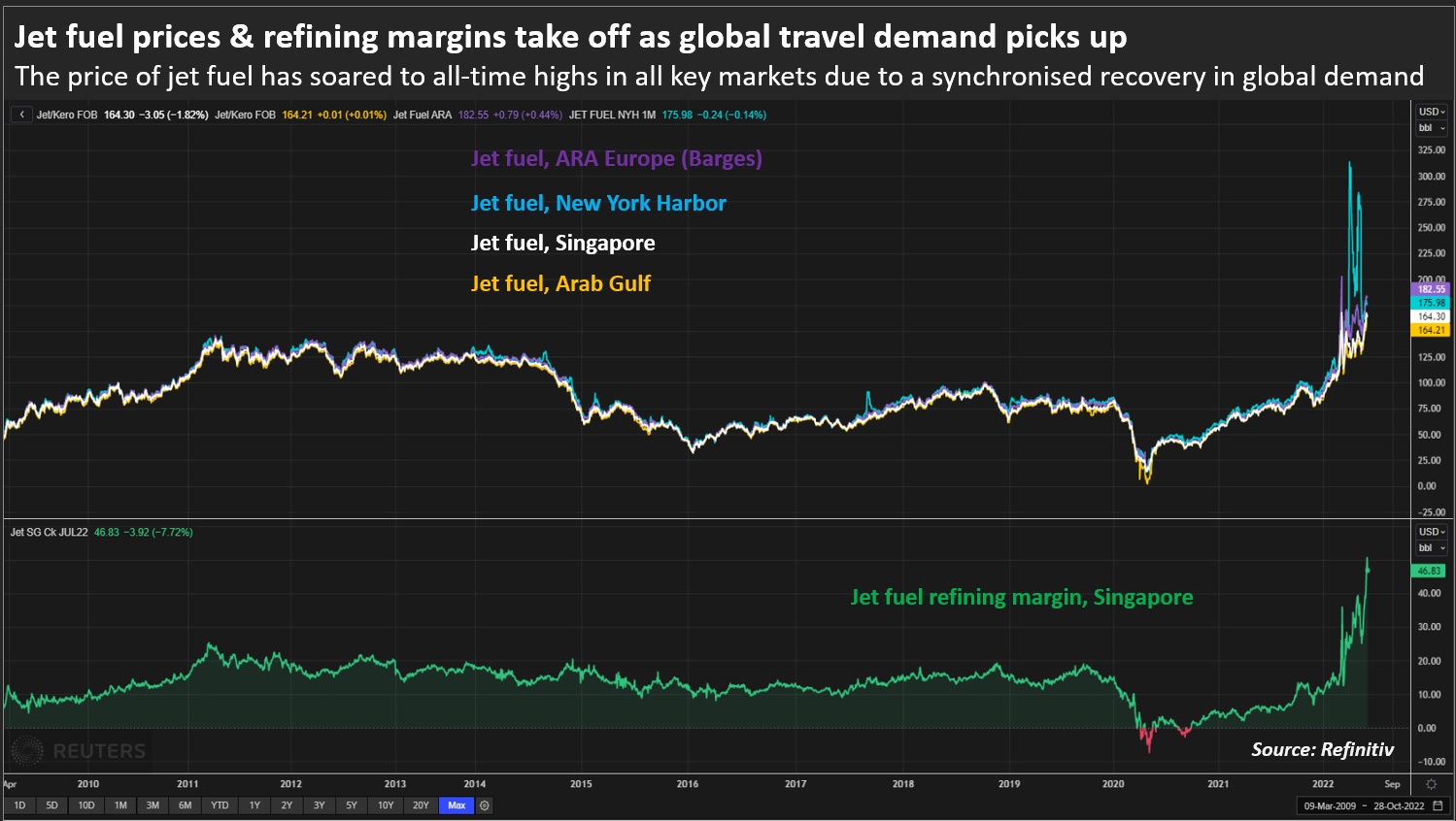 在供应方面,由于柴油裂解差价(即柴油炼油利润率)位于极高水平,炼油商将炼制柴油的优先级置于航空燃油之上的做法也将对航空燃油炼油利润率提供支撑。能源分析公司Vortexa的高级市场分析师Serena Huang表示:“需求增强的背景下,有限的航空燃油供应将支撑其炼油利润率。”
