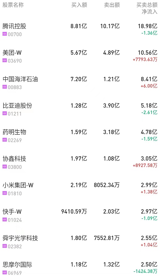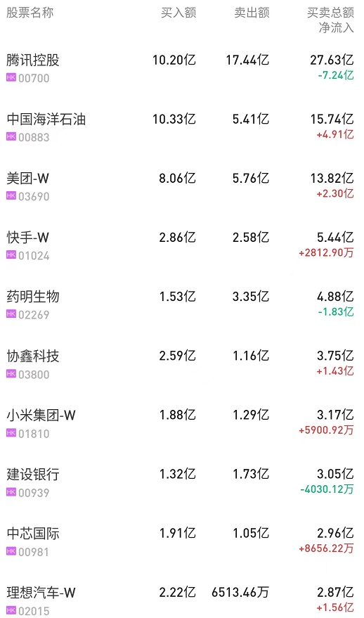 北水净买入最多的个股是中海油(00883)、美团-W(03690)、协鑫科技(03800)。北水净卖出最多的个股是腾讯(00700)、药明生物(02269)、建设银行(00939)。