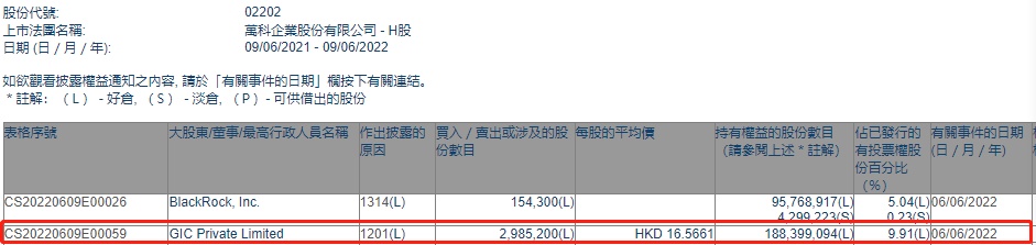 智通财经APP获悉,香港联交所最新资料显示,6月6日,GIC Private Limited减持万科企业(02202)298.52万股,每股作价16.5661港元,总金额约为4945.31万港元。减持后最新持股数目约为1.88亿股,最新持股比例为9.91%。