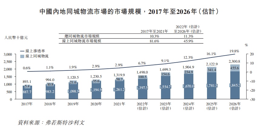与此同时,中国内地经济的快速增长、城镇化率的提高、移动互联网用户和在线支付用户的庞大规模以及在线物流服务优势所带来的强大市场需求,亦共同促进了在线同城物流渗透率的提高——在线同城物流的渗透率从2017年的0.6%提高到2021年的4.5%,预计于 2026年将进一步提高到19.8%。