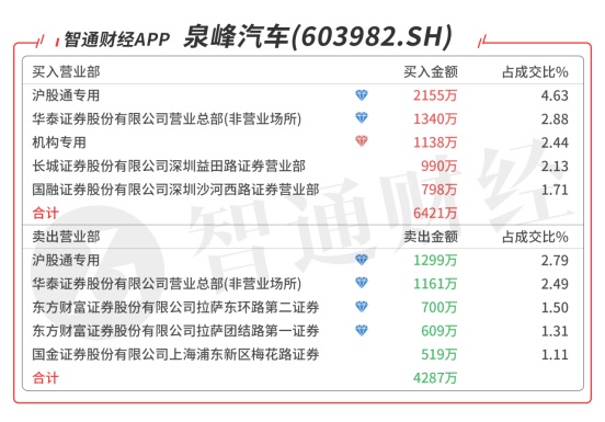 泉峰汽车(603982.SH):龙虎榜阵容豪华,机构席位买入1139万元,沪股通对倒净买入856万元,买二是知名游资的席位对倒净买入173万元,当日净买入2134万元,该股今日强势反包,预计压力位在半年线附近。