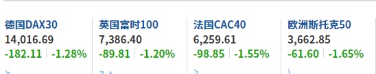 2. 截至发稿,德国DAX指数跌1.28%,英国富时100指数跌1.20%,法国CAC40指数跌1.55%,欧洲斯托克50指数跌1.65%。
