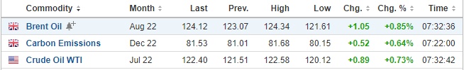 3. 截至发稿,WTI原油涨0.73%,报122.40美元/桶。布伦特原油涨0.85%,报124.12美元/桶。