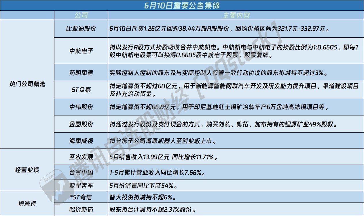 比亚迪股份:6月10日斥资1.26亿元回购38.44万股A股股份,回购价格区间为321.7元-332.97元。此前公司将回购上限由300元/股调升至400元/股,公司股价今日创下历史新高。