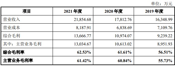 财务方面,于2019至2021年度,公司总营业收入分别约为1.63亿元、1.78亿元、2.19亿元人民币。公司综合毛利分别约为9239.22万元、1.1亿元和1.37亿元人民币,综合毛利率分别为56.51%、61.61%和62.53%,整体呈增长趋势。