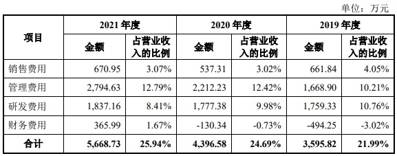 报告期内,公司研发费用分别为1759.33万元、1777.38万元和1837.16万元,占营业收入的比例分别为10.76%、9.98%和8.41%,总体保持稳定。