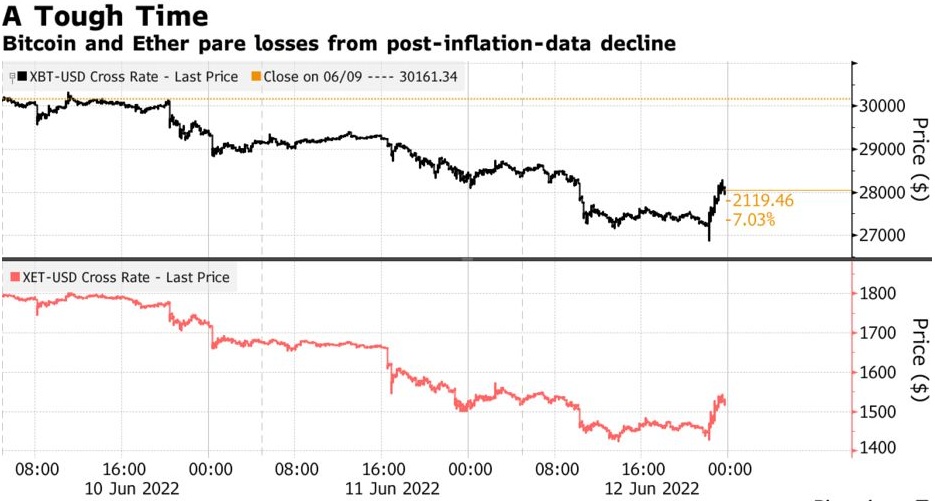 比特币和以太币收复失地。此前,在数据显示美国通胀触及40年新高后,比特币和以太坊在周日早些时候一度下跌。以太坊一度下跌6.4%至1424.40美元,为2021年3月以来的最低水平,而比特币则跌至26876.51美元,为5月12日以来的最低水平。