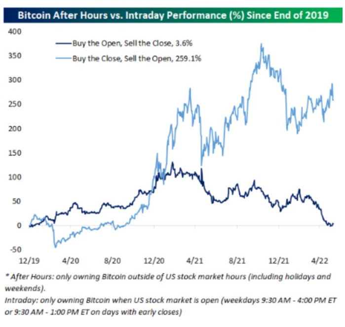 Bespoke Investment Group的数据显示,一个假设策略是在美国股市收盘时(美东时间16:00、北京时间第二天4:00)买入比特币,然后在第二天美股开盘时(美东时间9:30、北京时间、21:30)卖出比特币,从2020年初算起,这一策略的收益约为260%。相反,在美国股市开盘时买入,收盘时卖出,则收益3.6%。该公司发现,在周末,当股票投资者休息的周末时,比特币甚至倾向于走高。