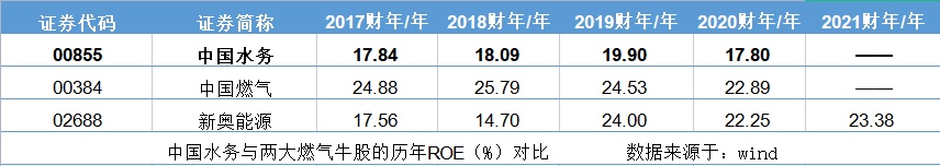 从过往历年的数据来看,中国水务的ROE与燃气行业的两只大牛股中国燃气、新奥能源也有一拼之力。wind数据显示,从2017至2020财年,中国水务的ROE分别为17.84%、18.09%、19.9%、17.8%,前三个财年稳中有增,表现明显优于波动性大的新奥能源;2020财年的ROE则因疫情影响稍有下滑,新奥能源也呈现出了同样的趋势。