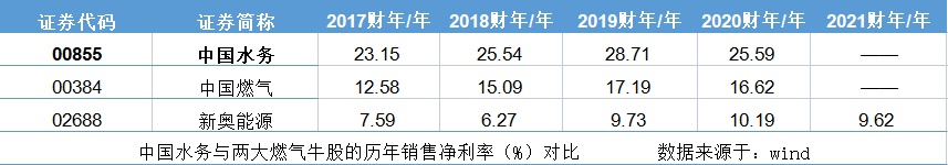 且从盈利水平上看,中国水务的优势同样明显。据wind数据显示,2020财年时,中国水务的销售净利率为25.59%,仍在市值超15亿的可对比同行企业中排名第一位,而中位值、平均值均在20%以下。同时,中国水务自2017财年以来的销售净利率分别为23.15%、25.54%、28.71%、25.59%,远高于燃气行业的新奥能源。
