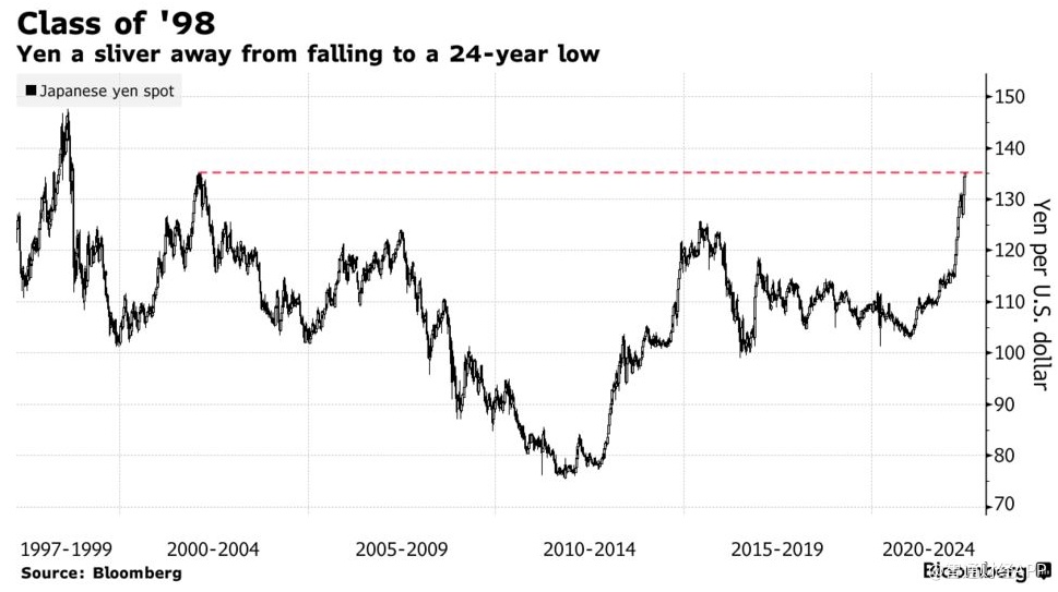 智通财经APP获悉,由于日本的宽松货币政策与其他发达国家的加息政策背道而驰, 日元汇率(美元兑日元)周一触及关键的心理关口135,创下20年来的新低。