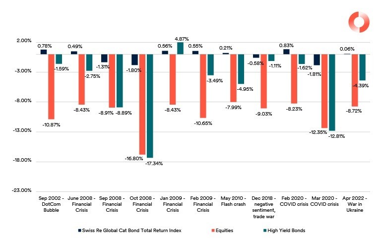 因此,在市场表现不佳期间,包括俄乌冲突导致市场动荡期间,保险证券与其他资产类别的低相关性仍然存在,这能够在为投资者带来稳定回报的同时降低投资组合的风险系数。数据显示,瑞士再保险巨灾债券指数(SwissRe Cat Bond Index)今年迄今为止表现良好。