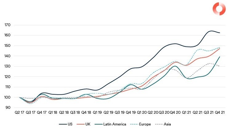 不过,防疫限制措施导致的供应链瓶颈加剧了通胀压力。今年年初,许多风险市场的估值相对较高,因此十分容易受到任何坏消息的影响。俄乌冲突则提供了催化剂,对经济增长的担忧加剧、再加上通胀飙升和利率上升,投资者们的大规模抛售影响了许多资产类别。