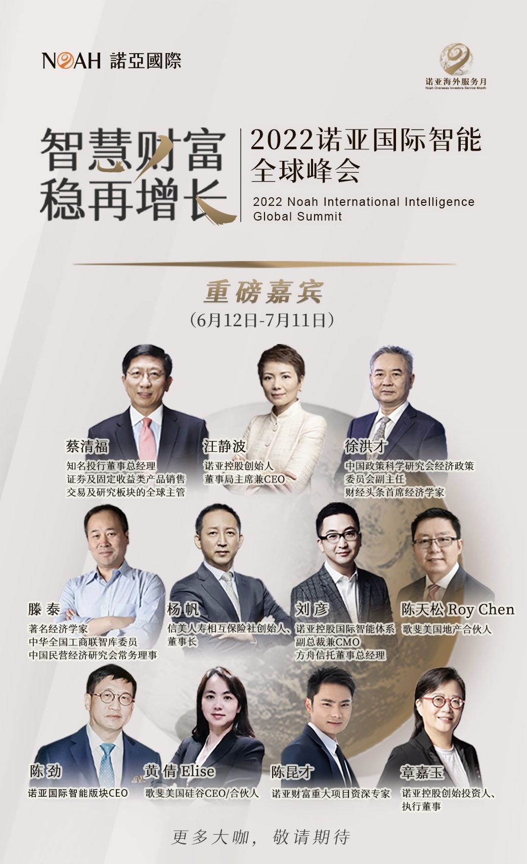 据了解,2022诺亚国际智能全球峰会为期一个月,将以四大主题周的形式展开。预计邀约三十余位重磅嘉宾与投资者共论变局,助力诺亚客户以更宽广的的视野把握投资硬趋势,与不确定性共舞,多维度汲取专业的财富智慧迎接未来挑战。