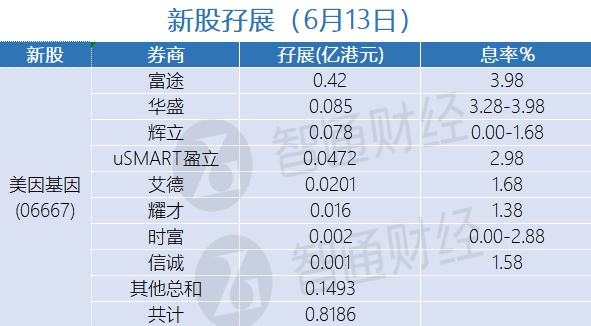 智通财经APP获悉,美因基因(06667)正在招股中。截至6月13日,富途、华盛、辉立、uSMART盈立、艾德等合计为其借出孖展0.8186亿港元,超购逾2.1倍。