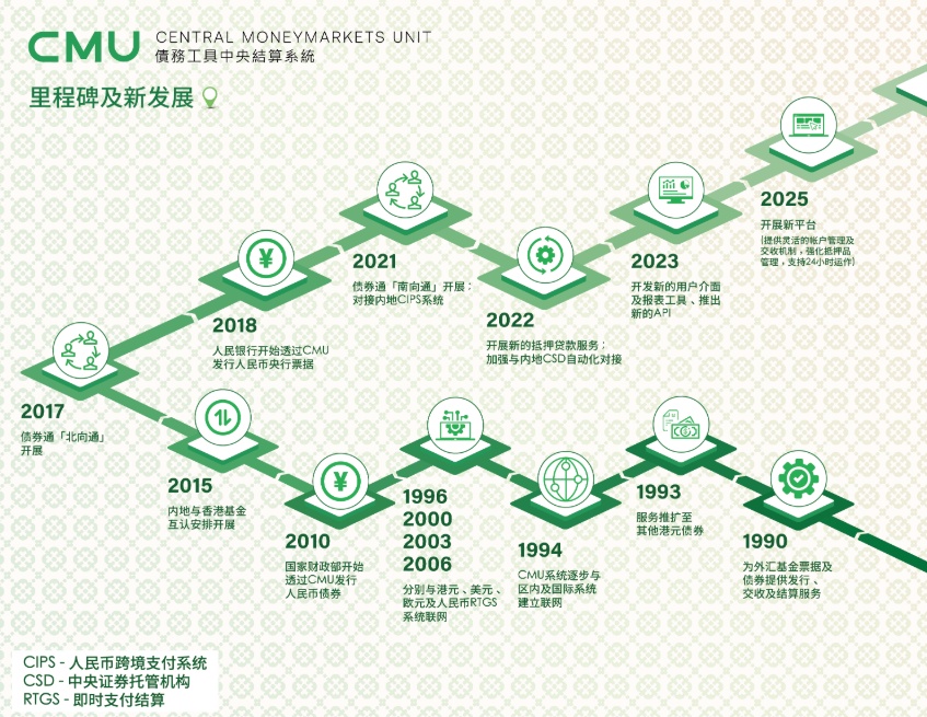 CMU是本地重要的中央证券托管平台。自1990年成立以来,便一直与香港金融市场同步成长,支持香港债市的发展。CMU的定位由最初仅为外汇基金票据及香港政府债券提供发行、交收及结算服务,拓展至为在香港发行的港元及外币债券,提供多币种结算、交收及托管服务。CMU早于1994年便开始与国际及区内系统建立联网,使其服务范围及对象更多元化。时至今日,不论是香港特别行政区政府发行的债券(例如近日发行的政府绿色零售债券)、以及由人民银行、财政部在香港发行的央行票据或人民币债券,都是由CMU一手包办。内地市政府及企业亦通过CMU在香港发行人民币债券。截至2021年底,存放于CMU在香港发行的债券总额超过2万亿港元。