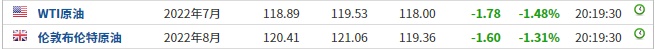 3. 截至发稿,WTI原油跌1.48%,报118.89美元/桶。布伦特原油跌1.31%,报120.41美元/桶。