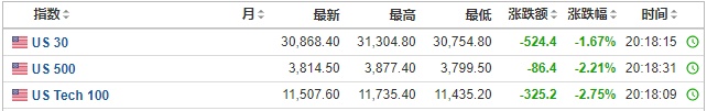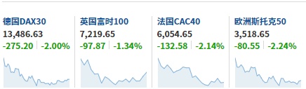 2. 截至发稿,德国DAX指数跌2.00%,英国富时100指数跌1.34%,法国CAC40指数跌2.14%,欧洲斯托克50指数跌2.24%。