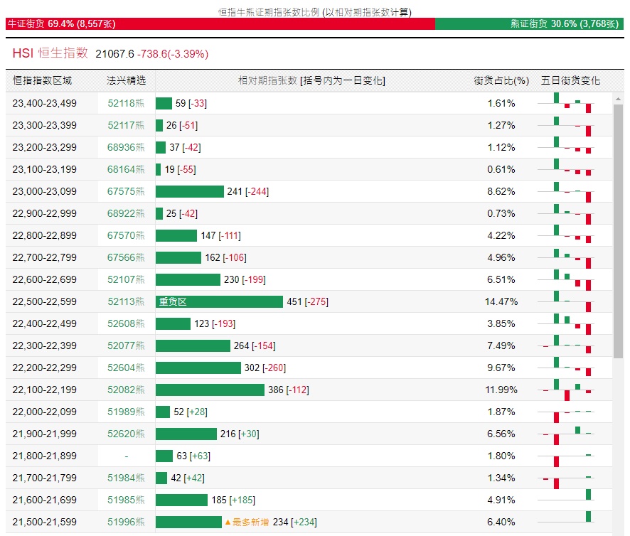 法兴恒指牛熊证街货分布图中的数据显示,熊证街货重货区在22500-22599区间,该区间最新熊证数量为451张,较上一交易日减少275张;最多新增在21500-21599区间,较该区间最新熊证数量为234张,较上一交易日增加234张。