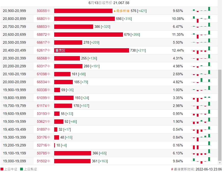 牛证街货重货区在20400-20499区间,该区间最新牛证数量为738张,较上一交易日增加211张;最多新增在20900-20999区间,该区间最新牛证数量为576张,较上一交易日增加421张。