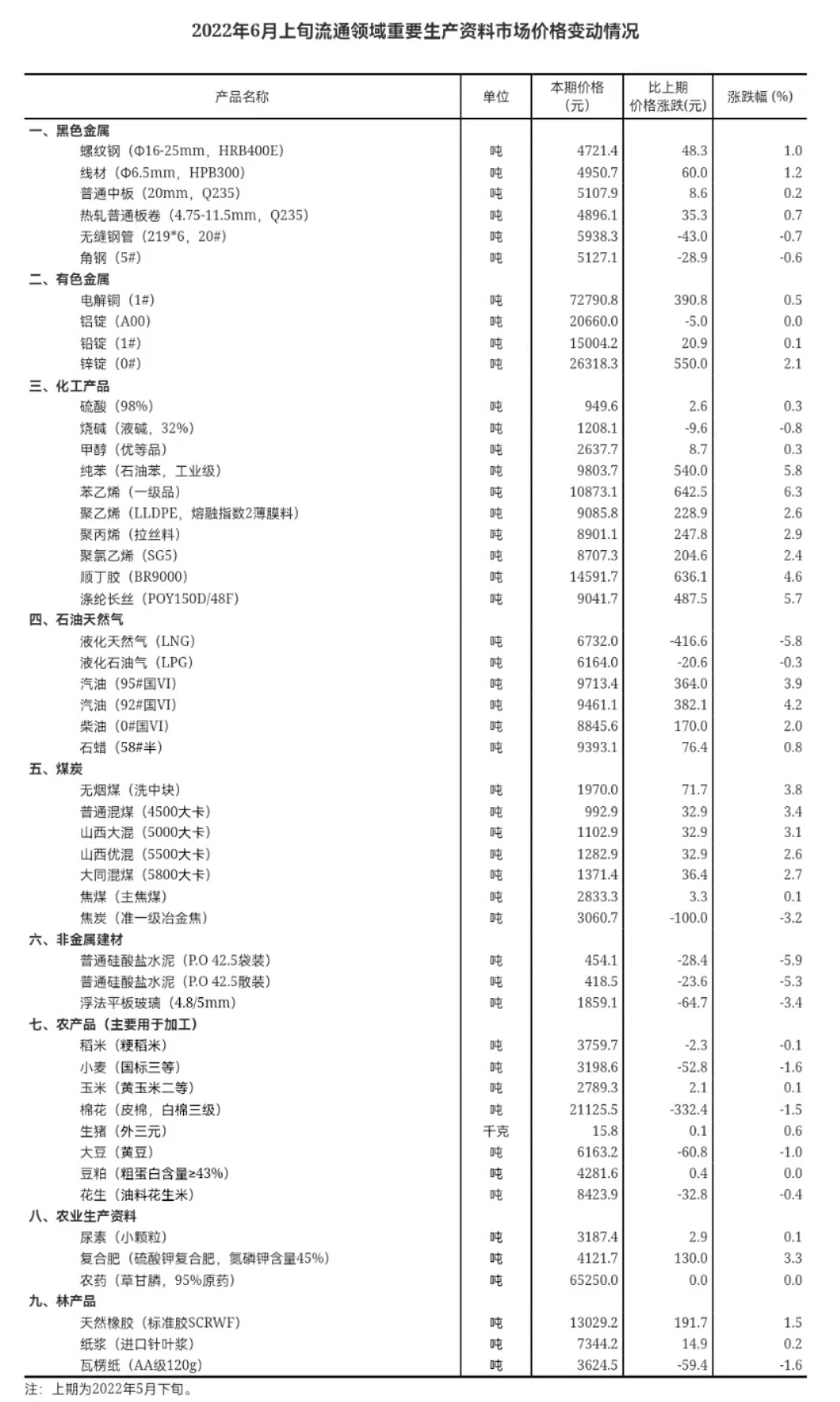 智通财经APP获悉,6月14日,国家统计局发布2022年6月上旬流通领域重要生产资料市场价格变动情况。据对全国流通领域9大类50种重要生产资料市场价格的监测显示,2022年6月上旬与5月下旬相比,32种产品价格上涨,15种下降,3种持平。