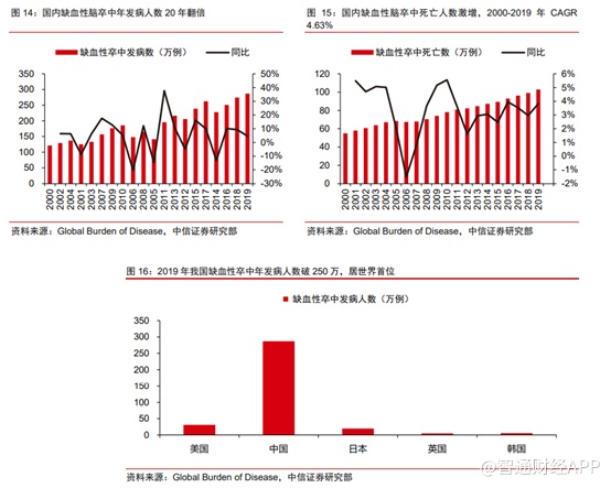 所有脑卒中病例中,近90%为急性缺血性脑卒中(AIS)。AIS是由脑动脉血栓或栓塞性闭塞引起,其特征是大脑某一区域突然失去血液循环,导致相应的神经功能丧失。随着人口数量增多及老龄化加剧,急性缺血性脑卒中(AIS)的新病例数稳步上升。根据Global Burden of Disease的数据显示,2000-2019年国内缺血性脑卒中的发病率已翻倍,年发病数从121.46万例激增至286.94万例,年复合增长率高达4.63%;2000-2019年国内缺血性脑卒中死亡数从55.01万例增至102.93万例,年复合增长率达到3.35%。2019年国内缺血性脑卒中年发病数是美国的9.25倍,日本的14.62倍,韩国的50.22倍,英国的58.11倍。