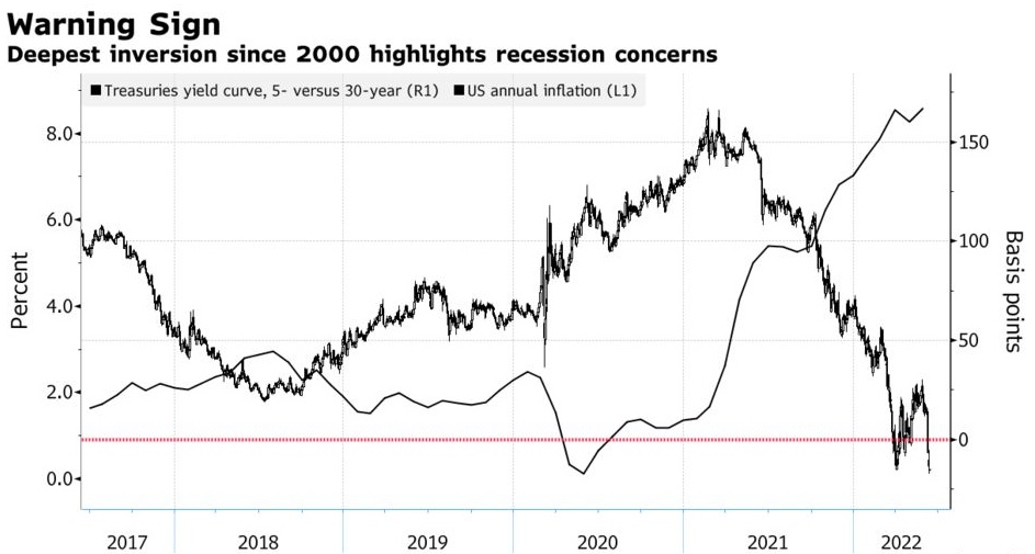 智通财经获悉,上周五美国通胀冲击促使交易员加大对美联储收紧步伐的押注,美国国债曲线的关键部分已发生倒挂。两年期美国国债收益率周一自4月以来首次超过十年期美国国债收益率,而五年期美国国债收益率则较30年期美国国债收益率高17个基点,为逾20年来最严重的倒挂。