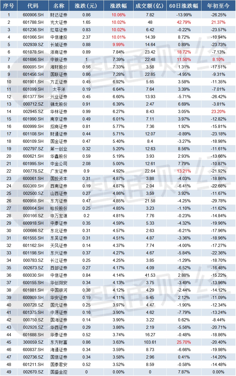 2000亿巨头中信建投也涨停,财达证券、红塔证券等多只股封涨停板。浙商证券、中银证券、广发证券、东方财富60日涨跌幅均为正。