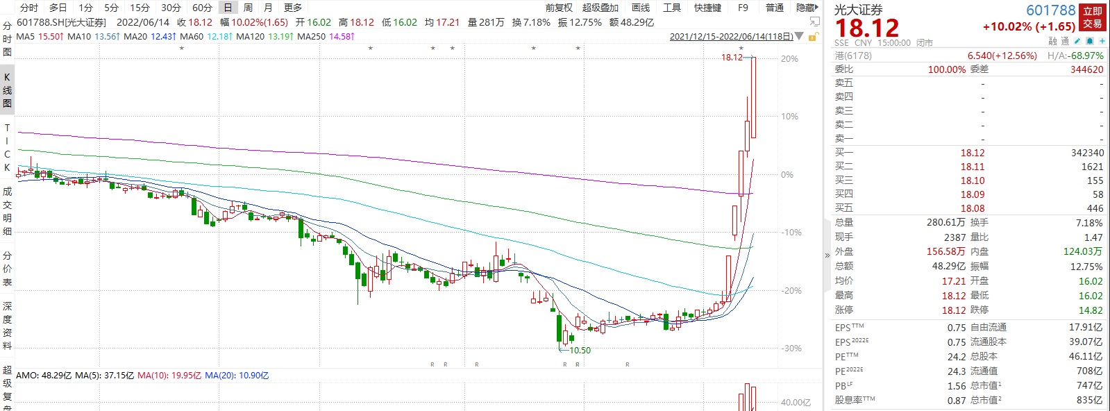 光大证券5天4板,创9个月来新高。自4月26日股价触底10.5元后,截至今日涨幅达57.57%,成交额达242.69亿。值得注意的是,光大证券60日涨幅达42.79%,且在今年券商股普跌的情况下仍能保持21.37%的涨幅。