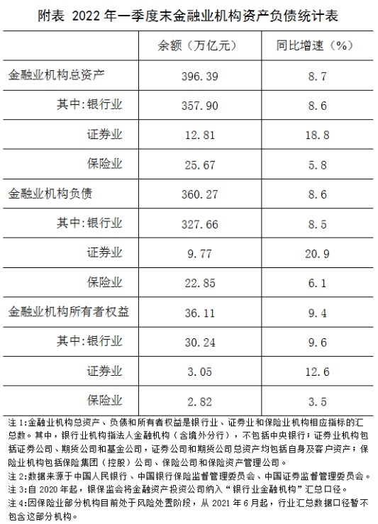智通财经APP获悉,6月14日,据中国人民银行最新发布显示,初步统计,2022年一季度末,我国金融业机构总资产为396.39万亿元,同比增长8.7%,其中,银行业机构总资产为357.9万亿元,同比增长8.6%;证券业机构总资产为12.81万亿元,同比增长18.8%;保险业机构总资产为25.67万亿元,同比增长5.8%。