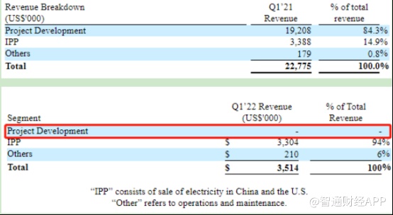 以2021年Q1季度为例,根据公司当时的财报数据,其总收入达到2277.5万美元,其中项目开发收入达1920.8万美元,占比为84.3%。相较之下,2022年Q1季度,瑞能项目开发收入为0,而IPP项目收入占比达到94%。