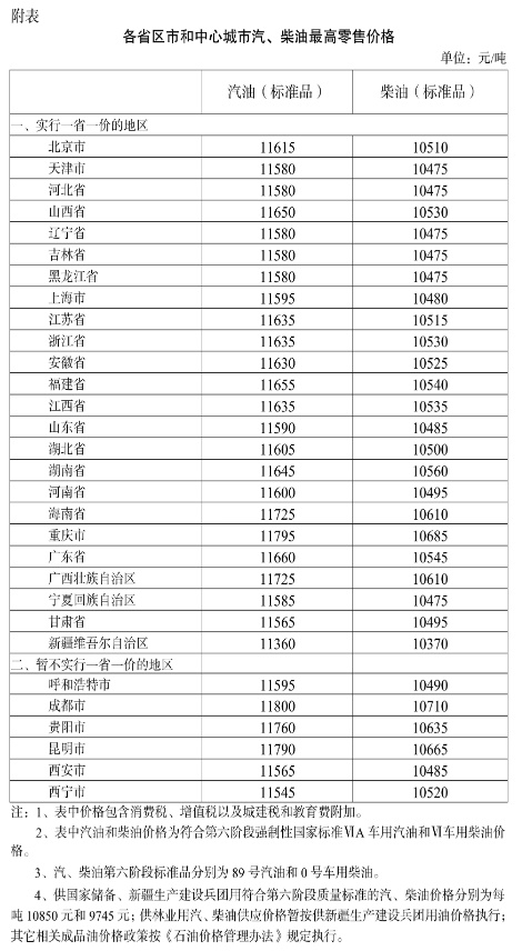 根据近期国际市场油价变化情况,按照现行成品油价格形成机制,自2022年6月14日24时起,国内汽、柴油价格(标准品,下同)每吨分别提高390元和375元。调整后,各省(区、市)和中心城市汽、柴油最高零售价格见附表。相关价格联动及补贴政策按现行规定执行。