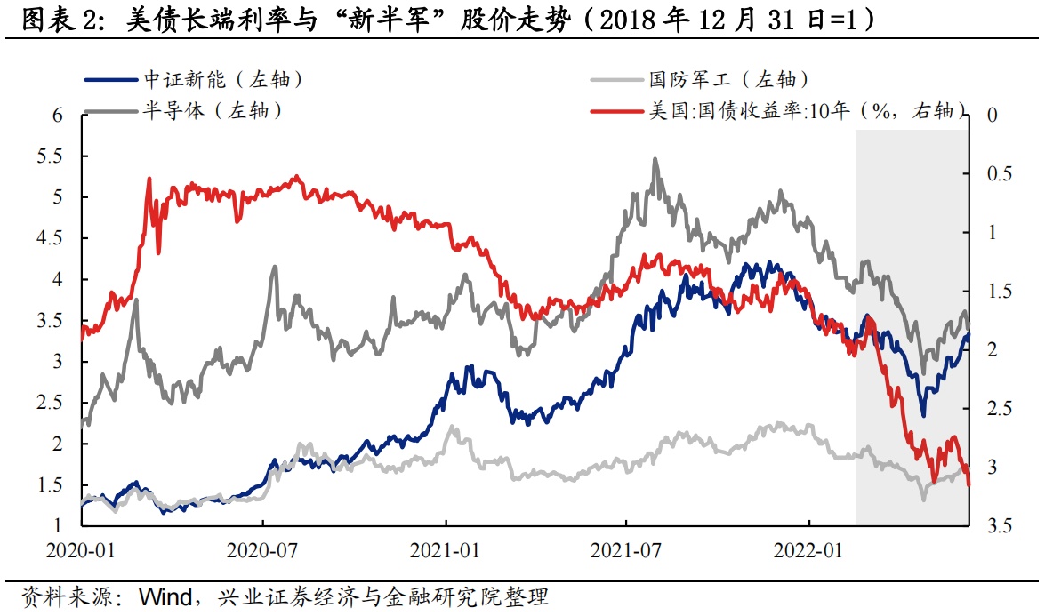 2月22日《“新半军”择时框架》中我们明确提出国内宏观流动性并非影响“新半军”股价的核心因素,海外美债长端利率才是最主要矛盾;4月12日《调整至今,“新半军”择时框架发出哪些重要信号?》再次强调,美债加速上行是3月下旬以来压制“新半军”的最主要矛盾,若进入高位震荡或回落,美债这一主要压制因素解除,“新半军”或将迎来修复,中期可观察5月初联储加息缩表情况。而5月以来,随着联储加息靴子落地,美债利率进入回落,也成为驱动“新半军”股价修复的最核心因素之一。