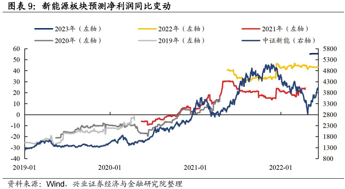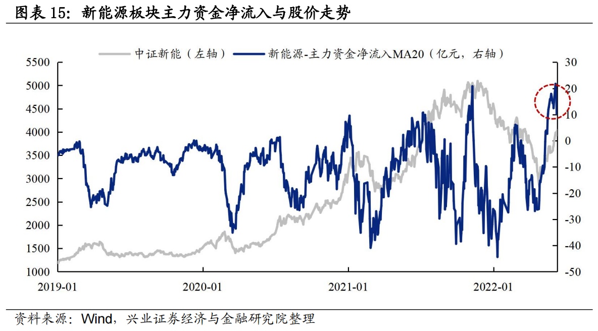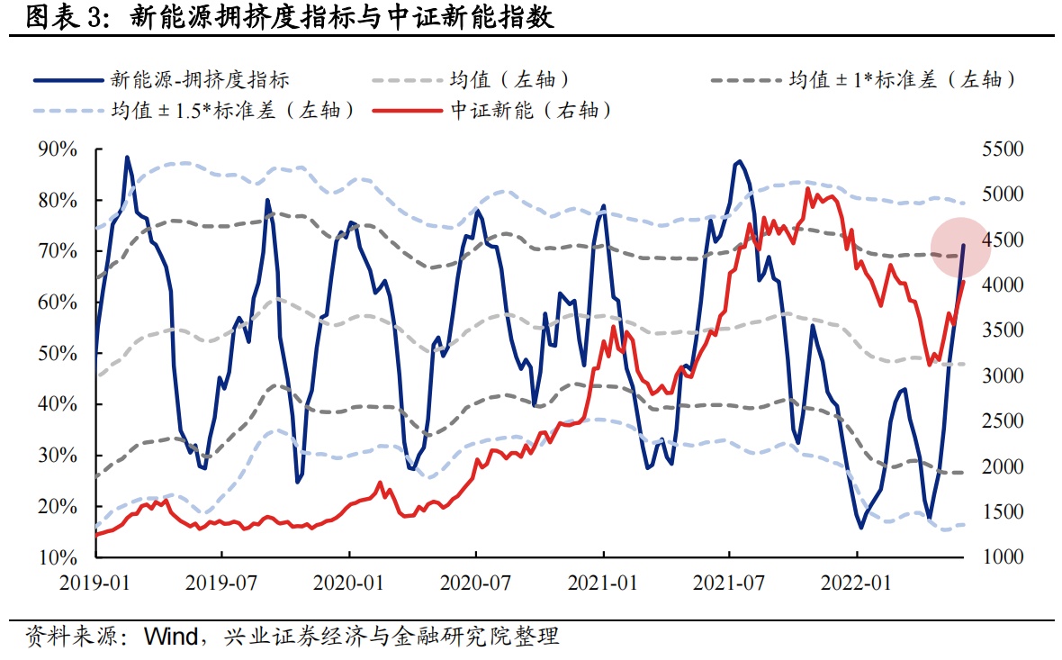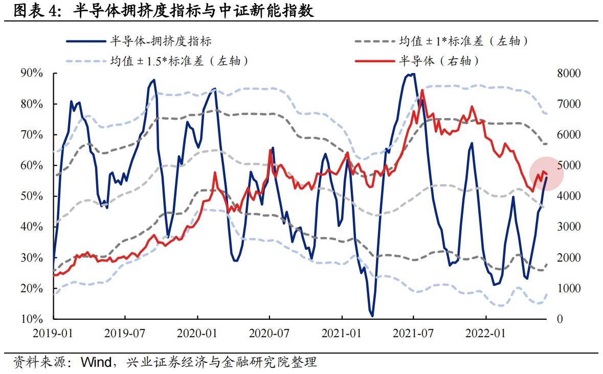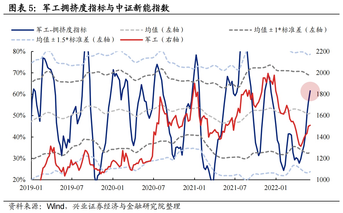 5月以来,随着“新半军”股价修复,拥挤度已自底部显著回升。拥挤度是该行独家构建的衡量热门赛道交易情绪的重要指标,对“新半军”短期股价走势具有较好的指示意义。4月后随着市场又一轮调整,“新半军”拥挤度再度降至低位,而随着5月以来股价修复,拥挤度已自底部显著回升,短期相对收益凸显。当前新能源拥挤度已升至均值+1倍标准差上限阈值上方,处于较高水平,半导体与军工拥挤度指标也已升至中等偏高位置。