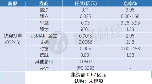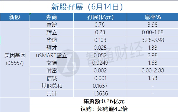 智通财经APP获悉,美因基因(06667)、快狗打车(02246)正在招股中。截至6月14日,富途、辉立、华盛、耀才、时富等合计为其分别借出孖展1.3636亿、近0.3293亿港元,美因基因超购逾4.2倍、快狗打车认购未足额。