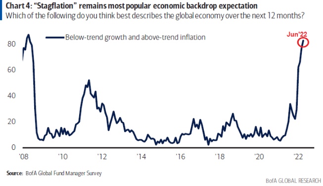 智通财经APP获悉,美国银行的月度基金经理调查显示,投资者对滞胀的担忧达到2008年金融危机以来的最高水平,而对全球增长的乐观情绪已降至历史低点。