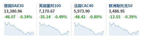 2. 截至发稿,德国DAX指数跌0.34%,英国富时100指数跌0.49%,法国CAC40指数跌0.80%,欧洲斯托克50指数跌0.39%。