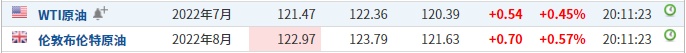 3. 截至发稿,WTI原油涨0.45%,报121.47美元/桶。布伦特原油涨0.57%,报122.97美元/桶。