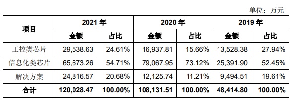 报告期内,公司主营业务收入按产品类别可分为工控类芯片、信息化类芯片、解决方案,于2021年度,工控类芯片实现收入2.95亿元,占比24.61%;信息化类芯片实现收入6.57亿元,占比54.71%;解决方案实现收入2.48亿元,占比20.68%。