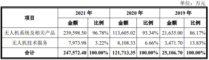财务数据上,于2019年度、2020年度及2021年度,中无人机年度营业收入分别约为2.51亿元人民币、12.17亿元人民币、24.76亿元人民币。公司净利润分别约为-988.07万元人民币、1.65亿元人民币、3亿元人民币。