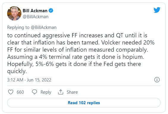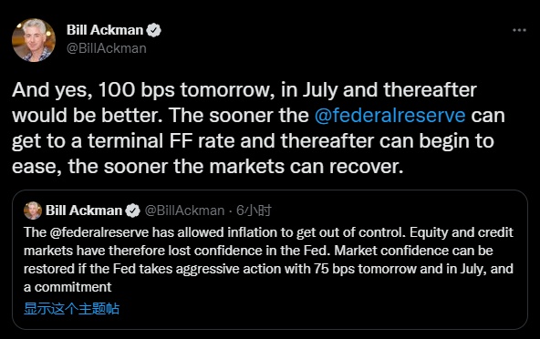 Ackman)周二表示,如果美联储周三就加息100基点、7月份再加息100基点并且之后继续保持,而不是像一些经济学家预期的那样加息75个基点的话,情况会更好。