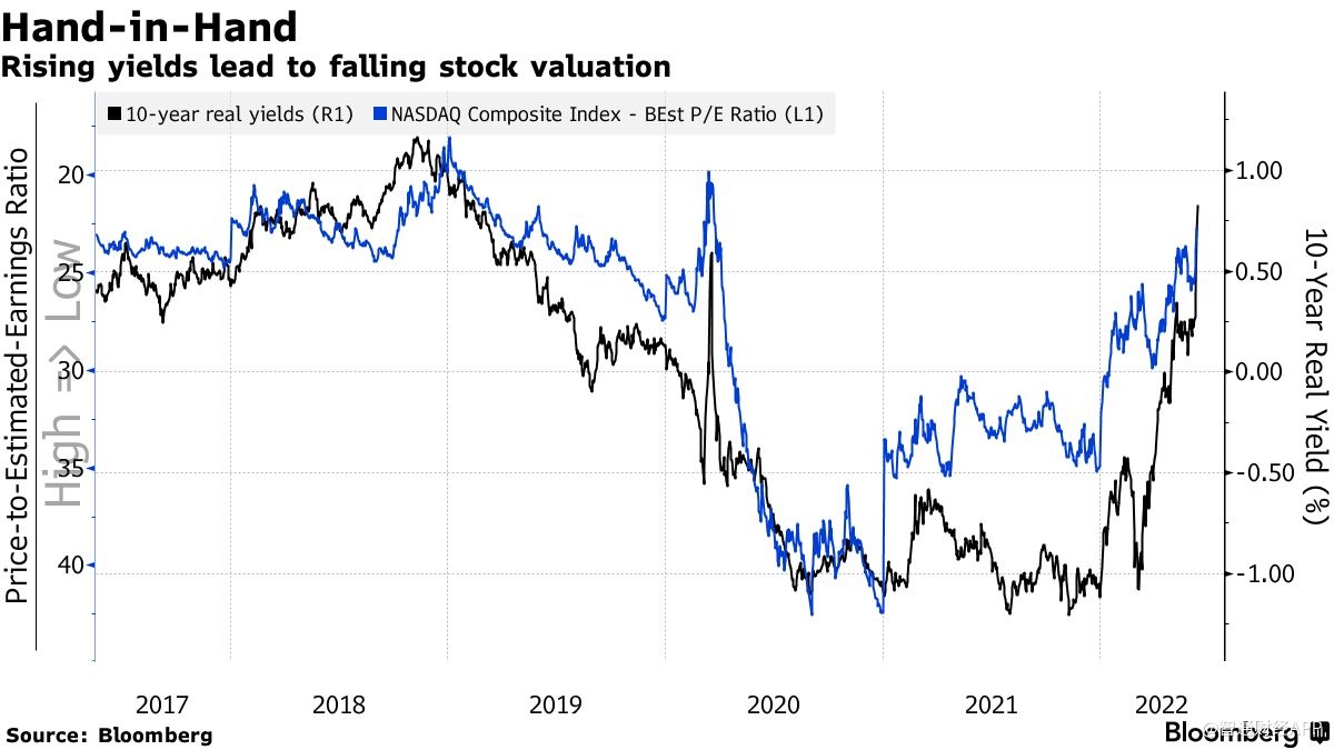 现在,这些对利率敏感的风险资产遭受重创。人们普遍认为,当经通胀调整后的债券收益率上升时,鉴于持有这些资产的机会成本不断上升,没有即时收入流的资产自然会下跌。