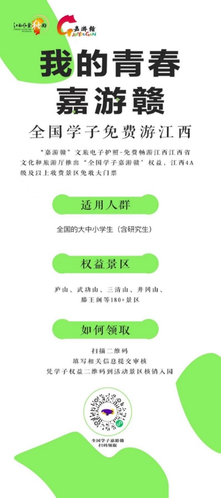 活动包含了派发“嘉游赣”文旅护照、免费开盲盒、趣味打卡等多种形式,吸引了众多学生的关注和参与。不少学生纷纷表示暑期将带着同学或家人去江西旅游。作为此次活动的重磅福利,全国的大中小学生(含研究生)均可免费申领“嘉游赣”文旅电子护照,获取“嘉游赣”学子权益,即可免大门票游江西省内4A级及以上收费旅游景区,包括庐山、武功山、三清山、井冈山、滕王阁等180余家著名景区。该权益可持续到2023年2月28日(含),全国学生都可以在此期间享受到这项实惠。