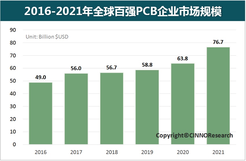 智通财经APP获悉,6月15日,CINNO Research统计数据显示,2021年度全球百强PCB企业的市场规模超760亿美元,较上一年度同比增长约20.2%,近五年均复合增长率达9.4%。受益于全球汽车电子及消费电子等PCB下游行业的需求旺盛,全球百强PCB企业的市场规模也保持持续增长趋势。