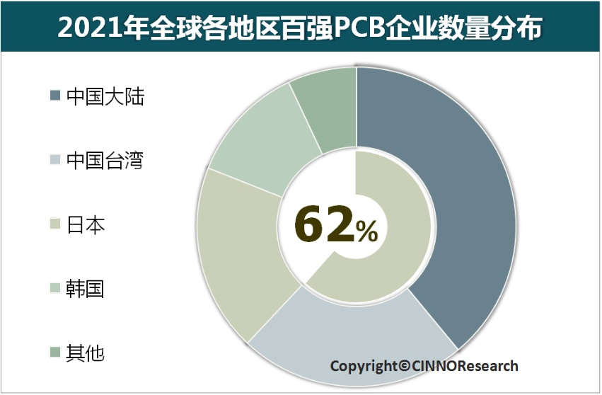2021年度上榜的中国企业总计62家,占整体百强企业超六成,中国企业在全球PCB行业中持续保持具足轻重的地位。其中,中国大陆企业39家,占比近四成,中国台湾地区企业23家,占比超过二成;日本企业19家,约占整体二成;韩国企业12家,占整体约一成多;其余国家及地区企业总计7家,占比不到一成。