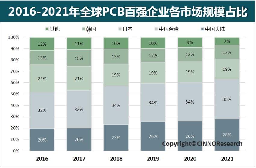 其中,中国大陆上榜企业的市场规模总额约为216亿美元,同比增长约29.1%,近五年年均复合增长率约为17.3%;中国台湾上榜企业的市场规模总额约为267亿美元,同比增长约22.8%,近五年年均复合增长率约为11.3%。中国企业在PCB市场规模的增速上领跑全球。