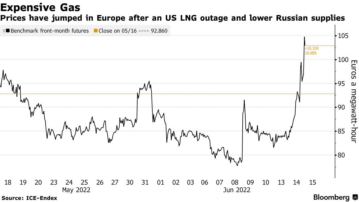 在美国LNG供应面临中断和俄罗斯供应量减少后,欧洲天然气价格大幅上涨